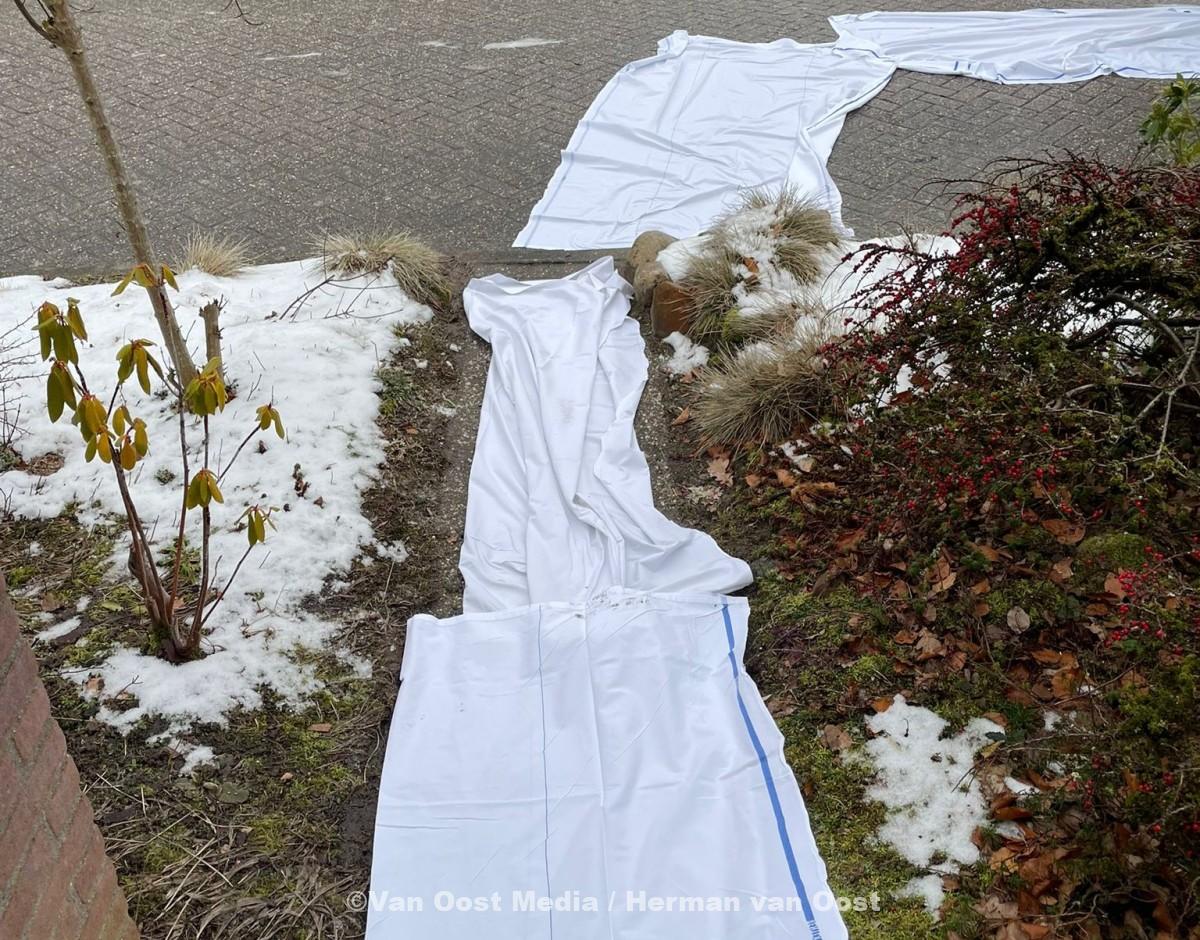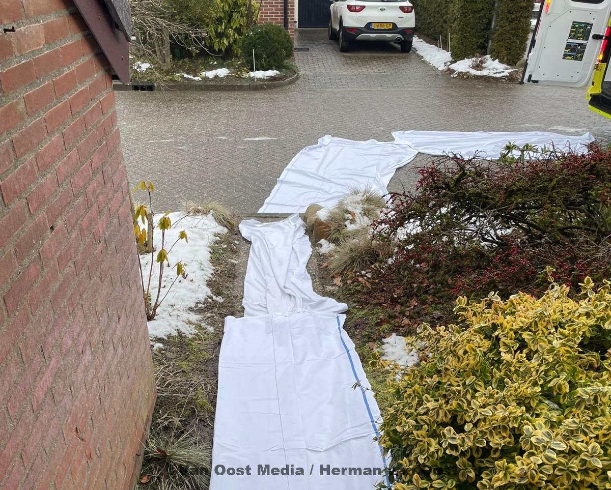 Zo werden de ambulancemedewerkers vindingrijk om de gladheid te lijf te gaan en legden ze lakens op de spekgladde stoep.