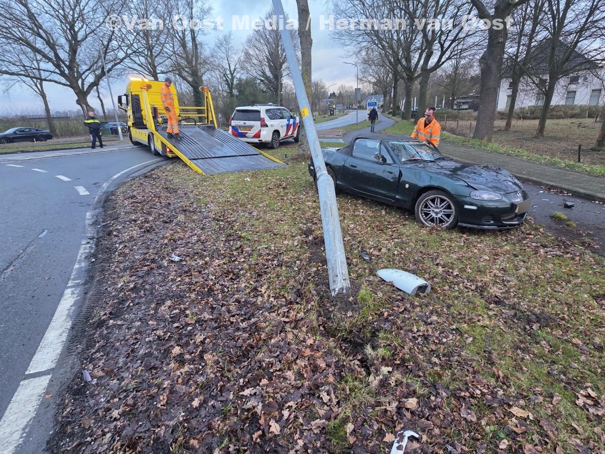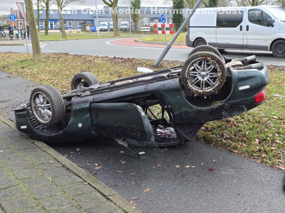 Na een botsing met een lantaarnpaal belandde de auto ondersteboven op het fietspad.