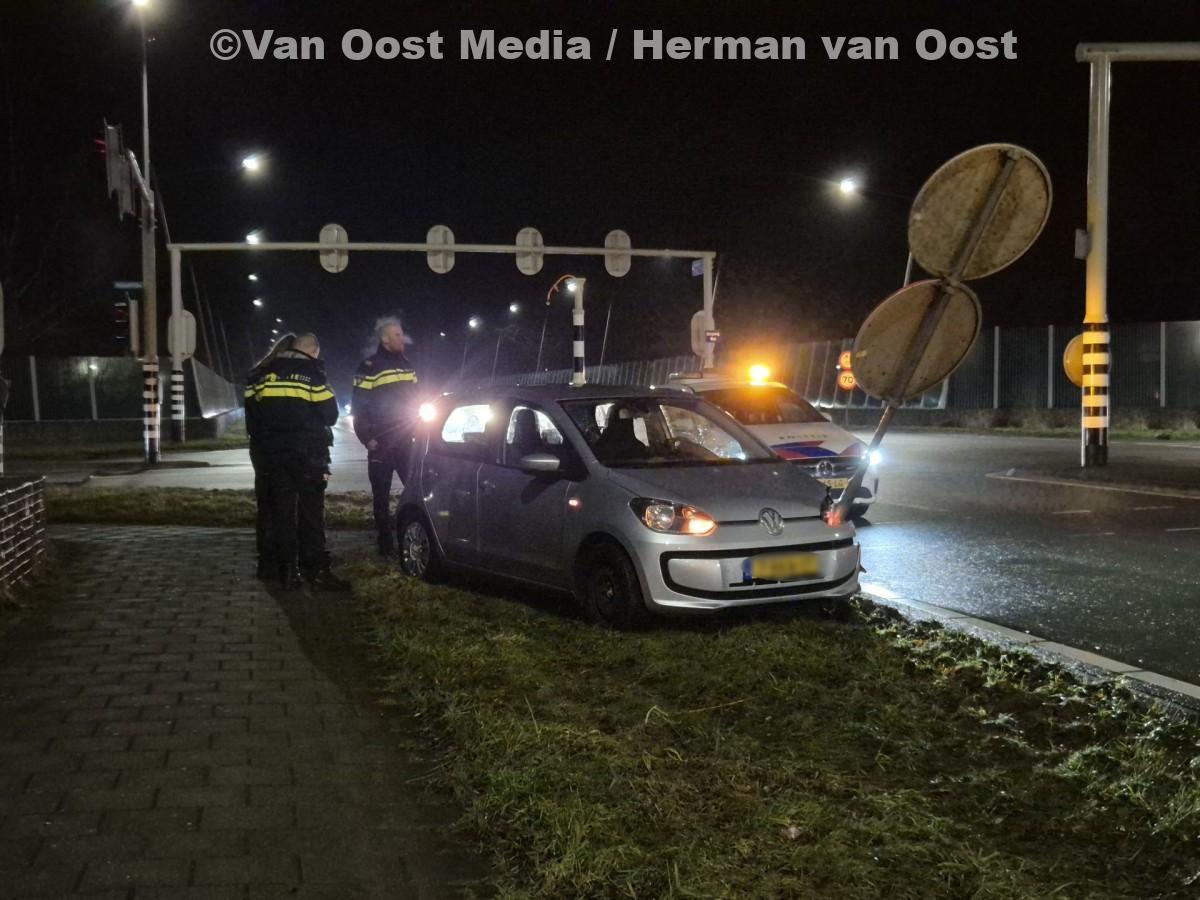 Hierbij heeft het voertuig een verkeersbord geramd en deze zit vast in de wielkast van de auto.