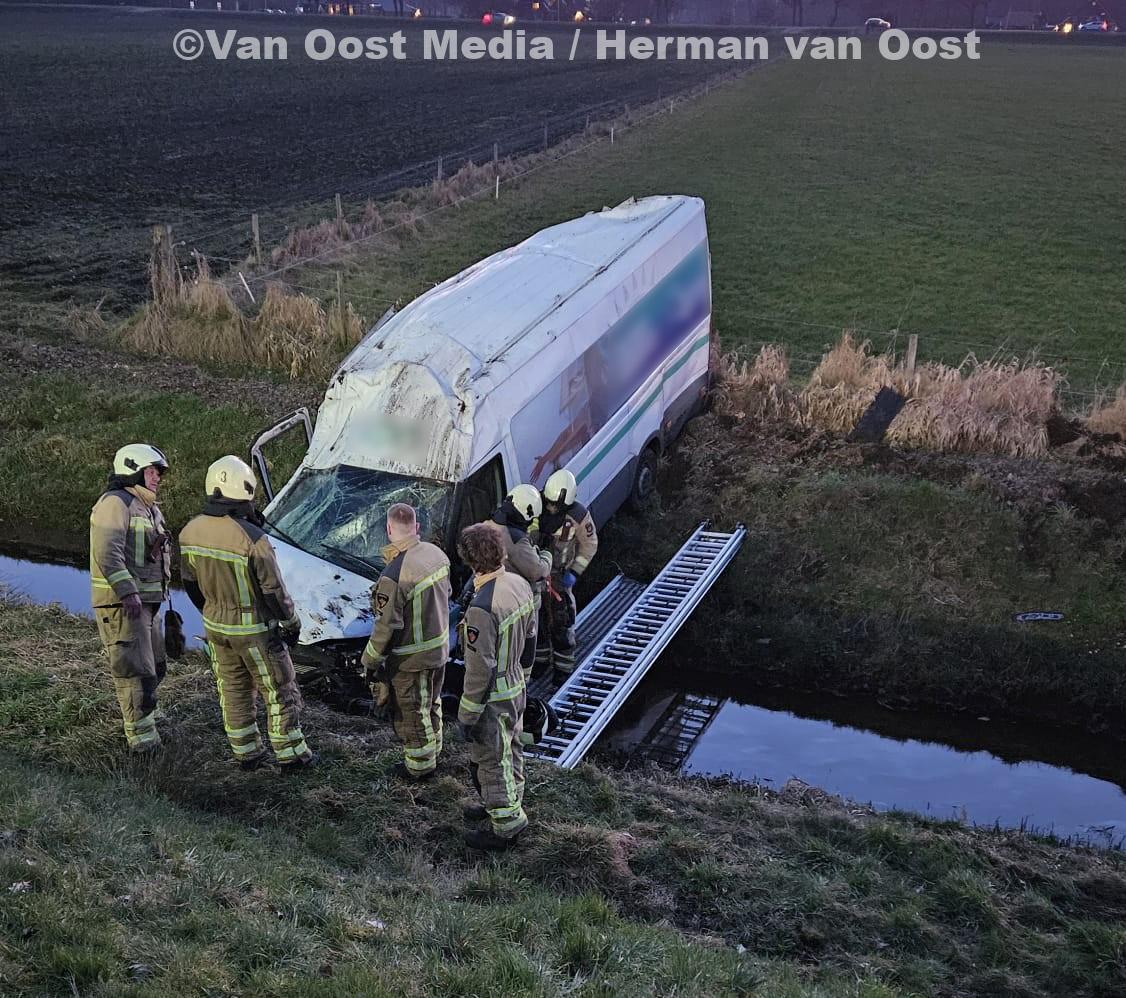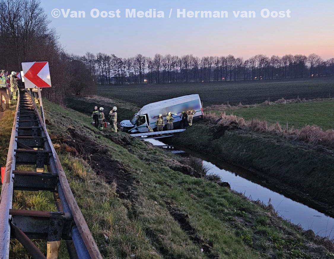 Een bestelbus is donderdagavond over de kop geslagen op de N34 bij De Punt, waarna de wagen over een sloot heen schoot en in een weiland tot stilstand kwam.