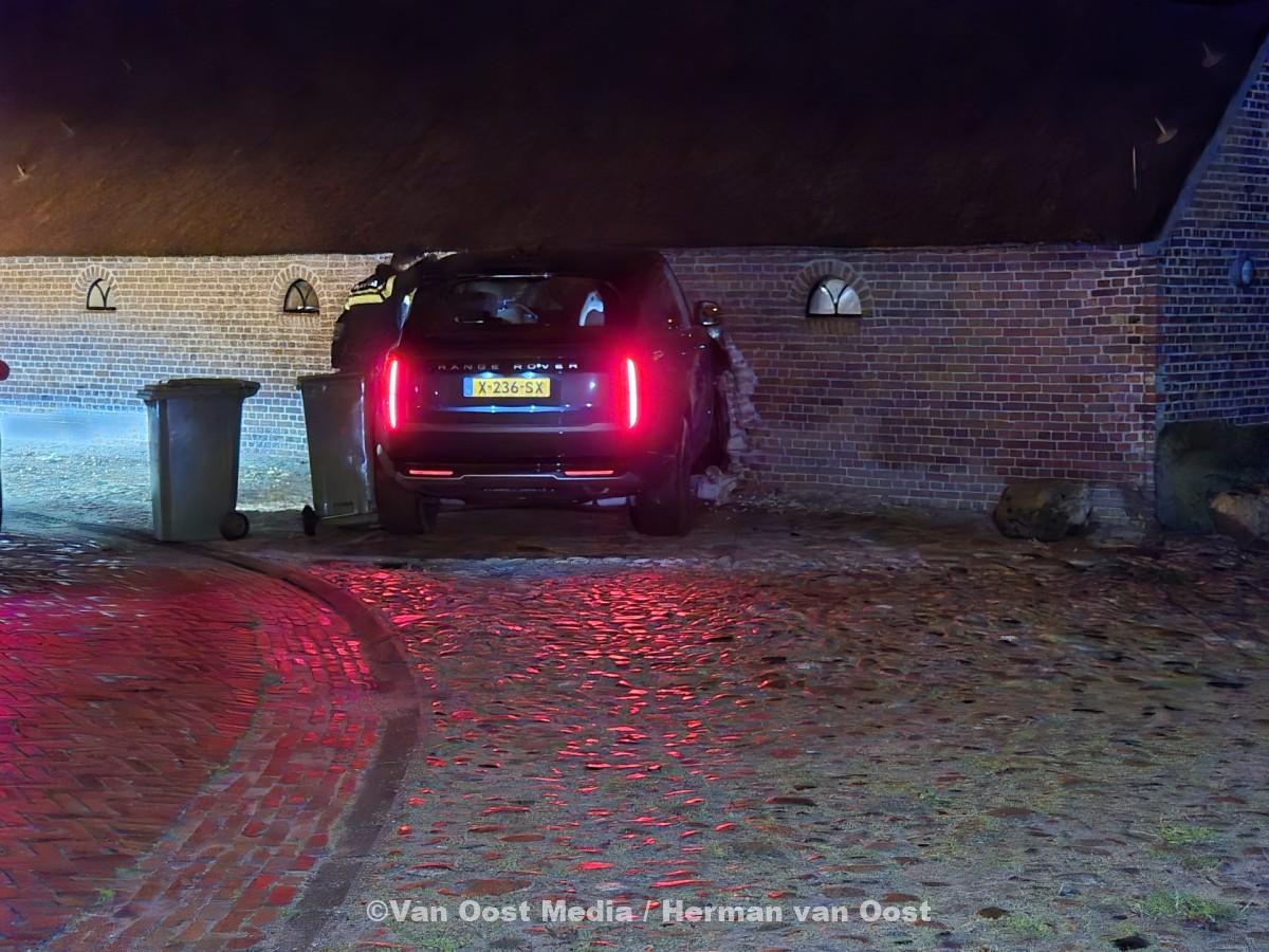 De eigenaar van de woning, Allard Krikke is dwars door de knal heen geslapen. ,,Mijn zoon maakte me wakker”, zegt hij enkele uren na de klap. Siemen, de zoon van Krikke, dacht eerst dat er een boom was omgevallen. ,,Maar toen ik buiten kwam, was er ook al heel snel politie. Die zaten namelijk achter de Range Rover aan.”